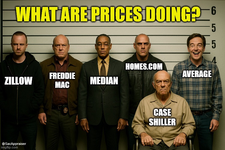 We’re missing about 30% of the normal number of sales today, which is true locally and nationally. As a result, traditional price stats like the median and average can bounce around even more than usual. This is why I’ve been talking more about various price indexes such as the ones below. A price index tries to control for differences in quality or size, so sometimes an index might give us a better reading of price movement (not always). The hard part is there are only so many publicly available price indexes for a given metro area. I’m not interested in a national index. What do various sources show for just Sacramento? That’s the key.